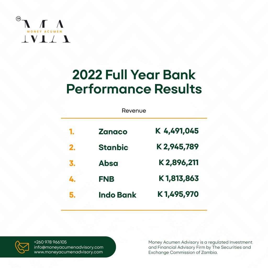 The 2022 Bank performance results have been released with Zanaco in the lead for a second year in a role posting first in NET PROFIT at K1.35 Billion for the financial year ended December, 2022. ABSA rallied close with a K1.32 Billion Profit After.