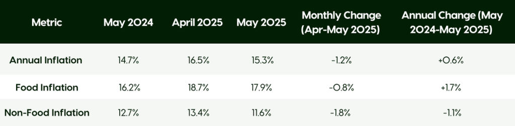 On the other hand, non-food inflation has improved significantly, dropping to 11.6% in May 2025 from 13.4% the previous month. Compared to last year, non-food price increases have actually fallen by 1.1%, providing some relief for expenses like transport, utilities, and services. This slowdown is likely due to stable fuel prices and reduced supply chain disruptions. For consumers, the slight monthly slowdown in inflation (prices rose just 0.3% in May compared to 1% in April) means that while living costs are still rising, the pace is easing. Food remains expensive, but better harvests could lead to further relief in the coming months. Meanwhile, the drop in non-food inflation helps free up household budgets for other essentials.